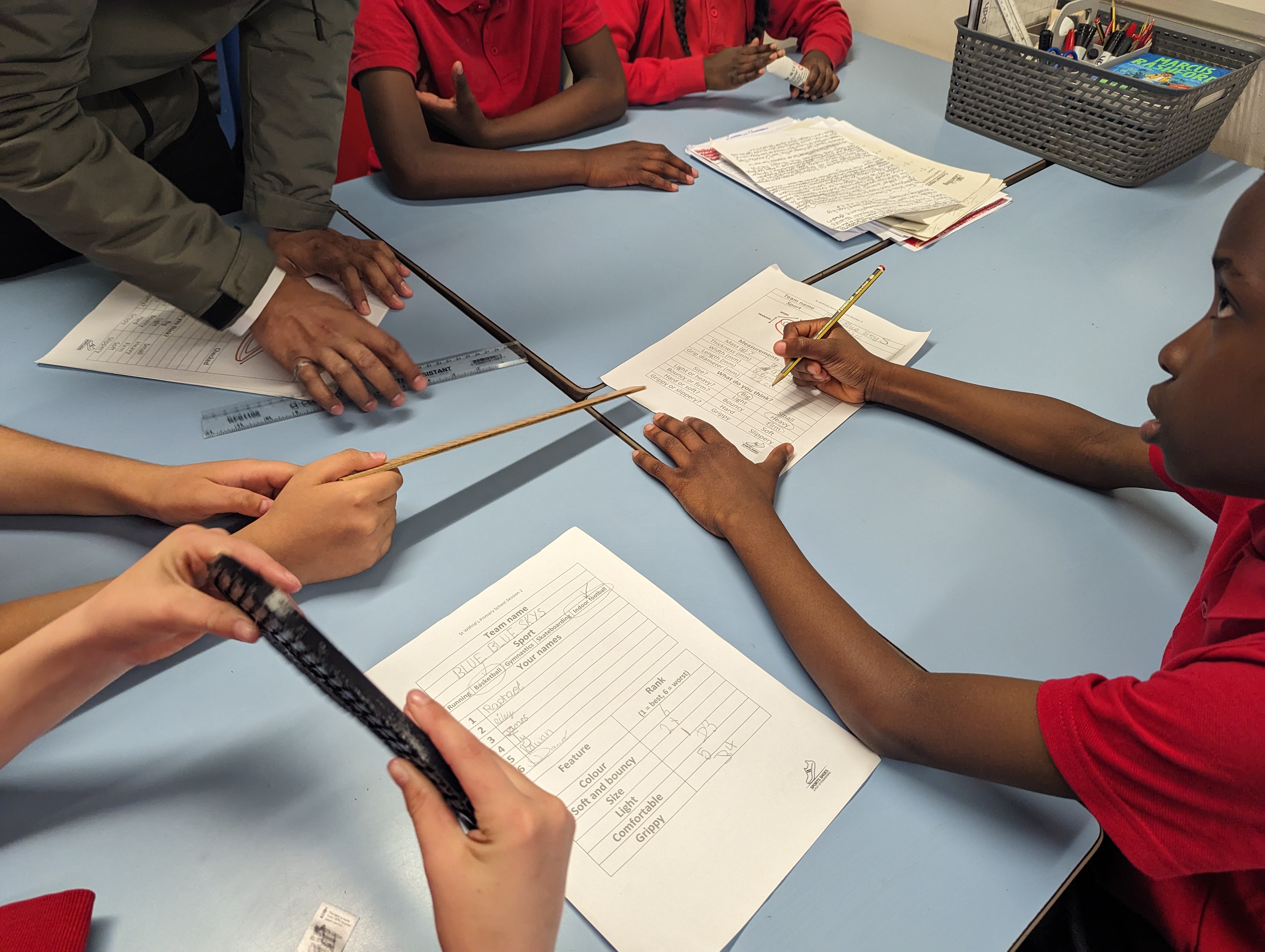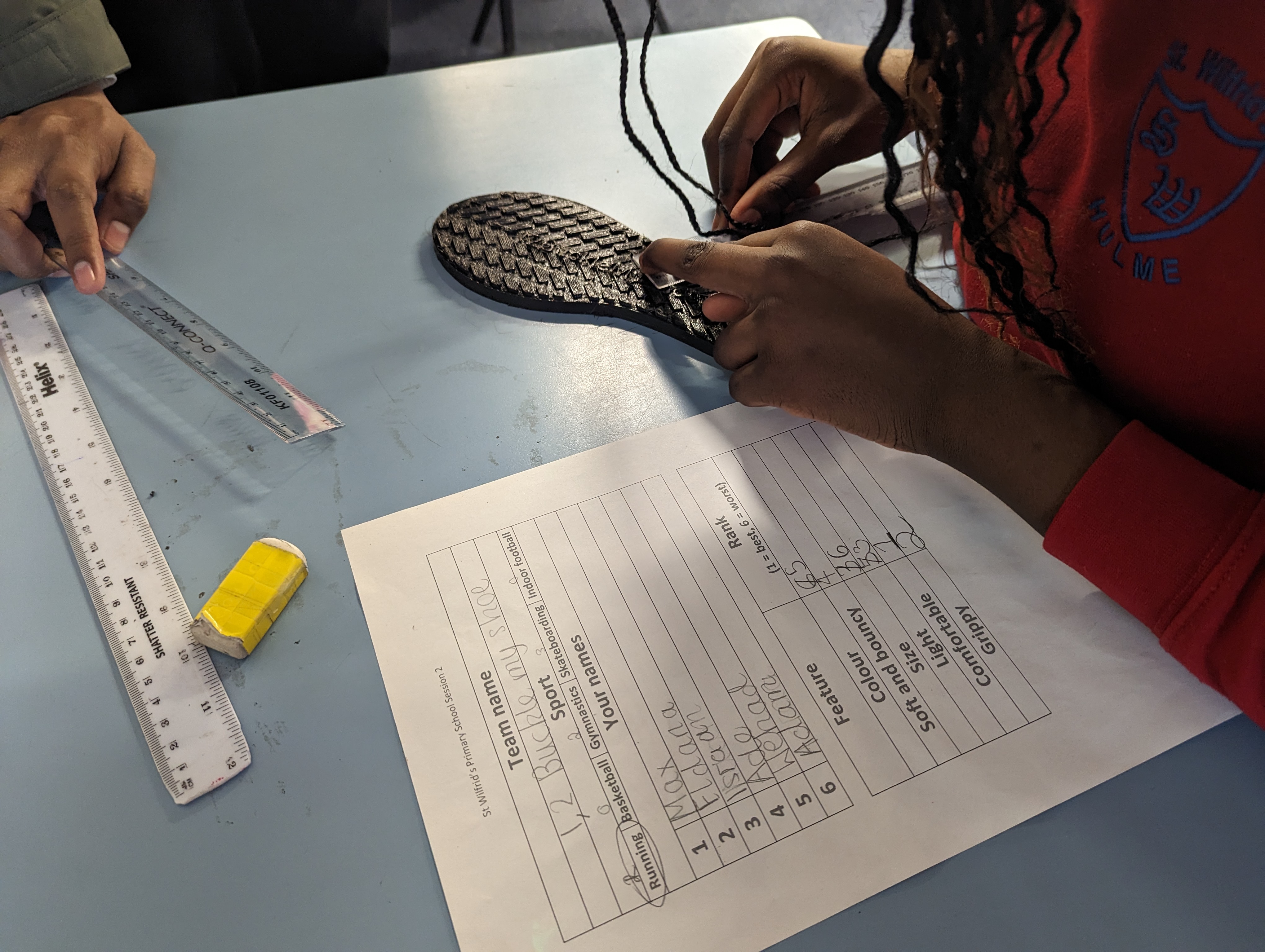 The children received A6 versions of the posters and a project sticker. They handled various dissected shoes while discussing how the design related to the intended purpose for each sport.